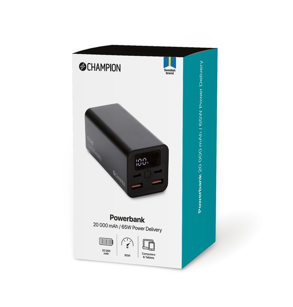 Oavsett om du är hemma, på arbetsplatsen, på resande fot eller ute på äventyr är Champions 20.000mAh Powerbank din pålitliga partner.